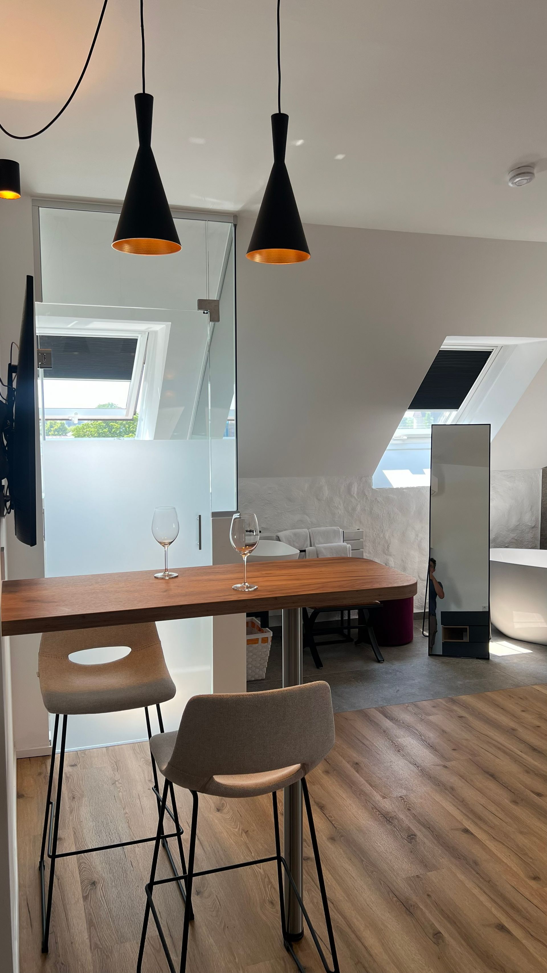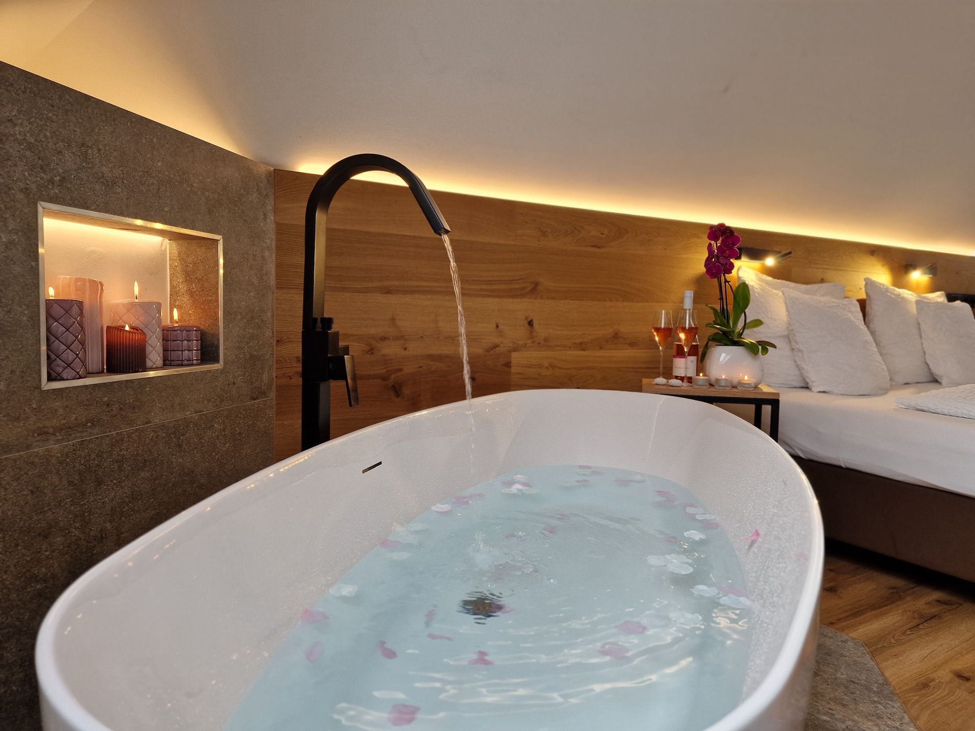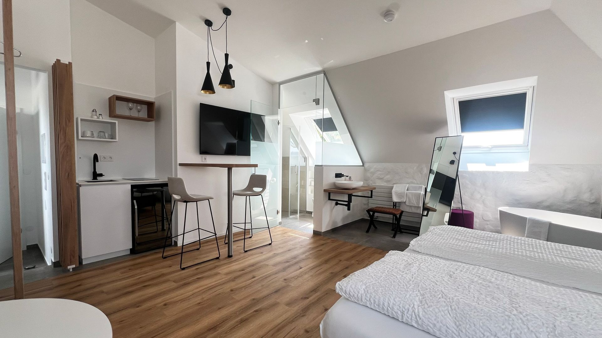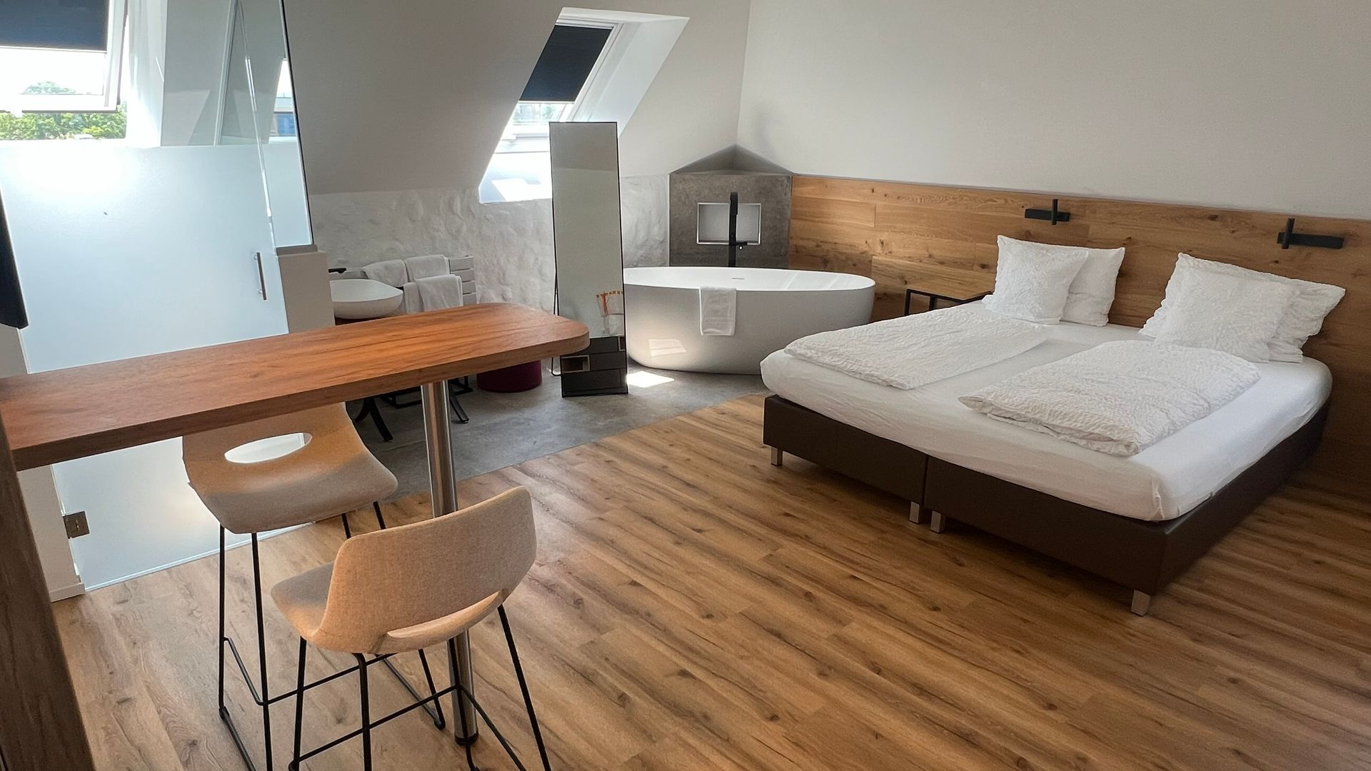 JuniorSuite mit freistehender Badewanne, kleiner Küche, Badezimmer im Glascube, einem Doppelbett, Wohlfühlmatratze, antiallergische Kissen und Decken