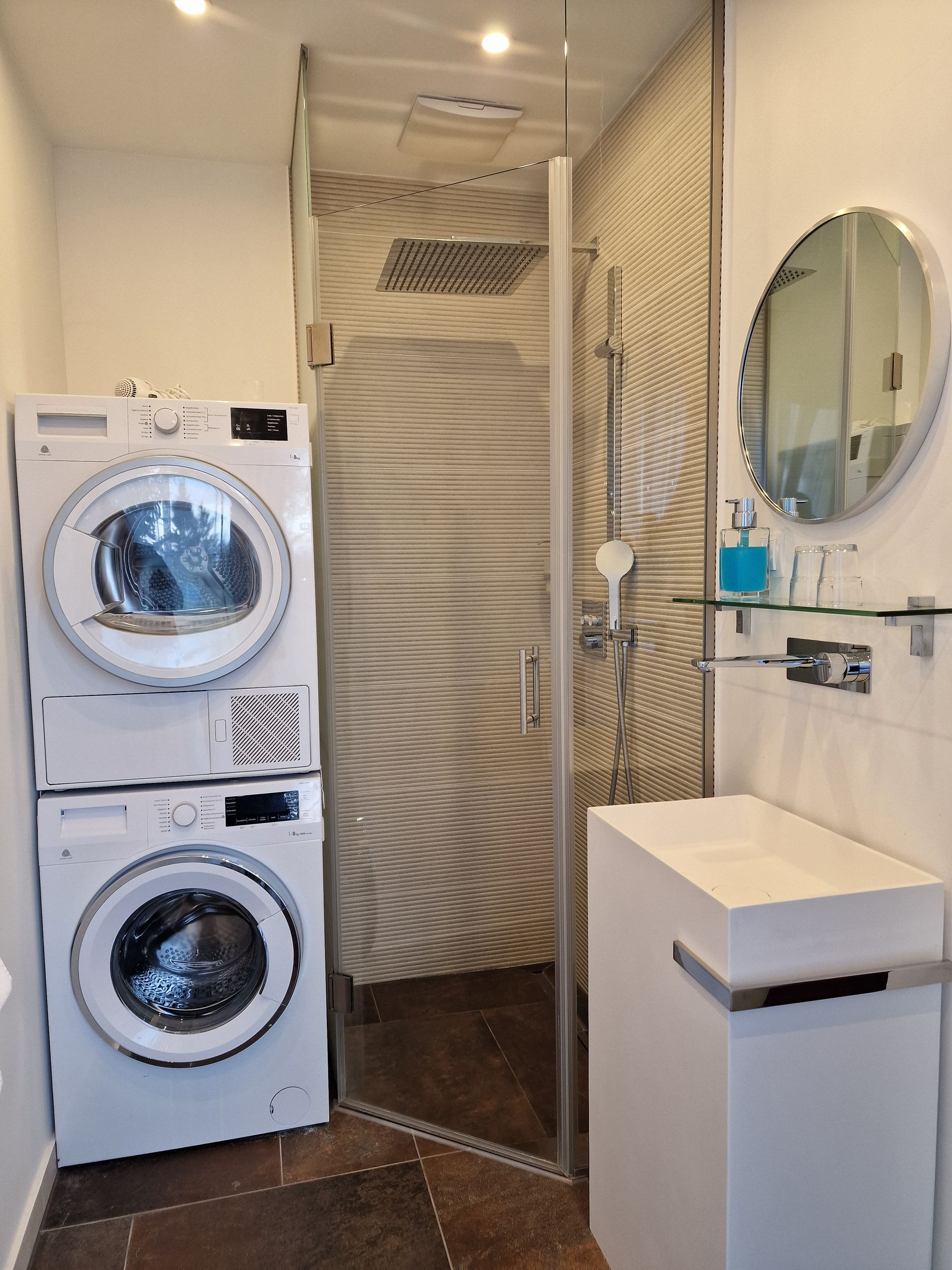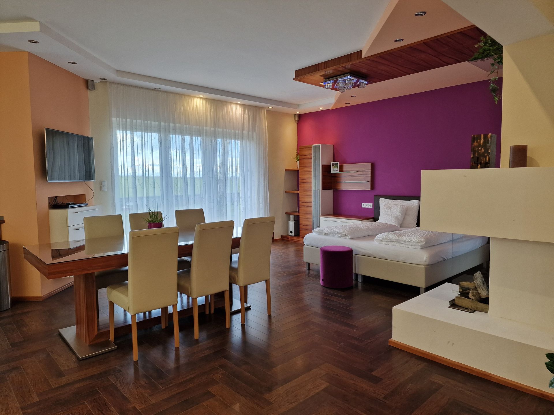 JuniorSuite mit kompletter Küche, großem Esstisch, Terrasse, Badezimmer mit Wellnessdusche, Waschmaschine, Wäschetrockner, Doppelbett mit Wohlfühlmatratzen, antiallergische Kissen und Decken, 2 Schlafsofas, großer Esstisch